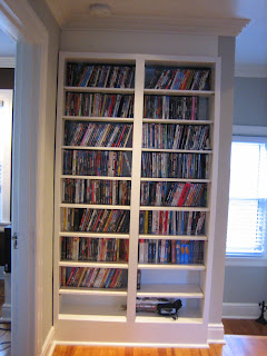 The built-in shelves in the hallway were previously stained a dark wood, which stuck out among the rest of the white trim, so Matt repainted them white and cut new shelves to make a space for our (his) massive DVD collection. We’re still thinking about adding doors to it for a more custom look: